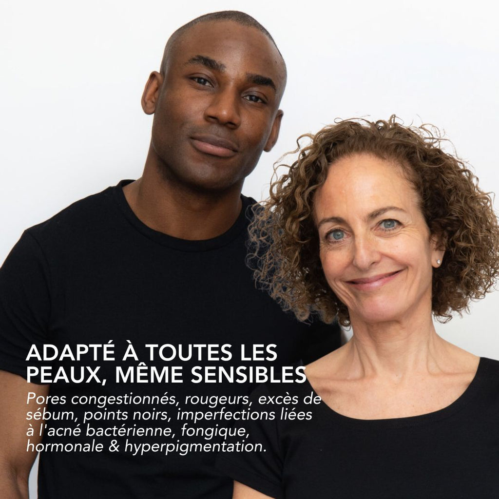 Une alternative naturelle et efficace aux traitements sur ordonnance pour les pores congestionnés, les rougeurs, l'excès de sébum, les points noirs, les imperfections liées à l'acné bactérienne (acné vulgaris), l'acné fongique, l'acné hormonale, ainsi que l'hyperpigmentation résultant de l'inflammation post-acnéique.