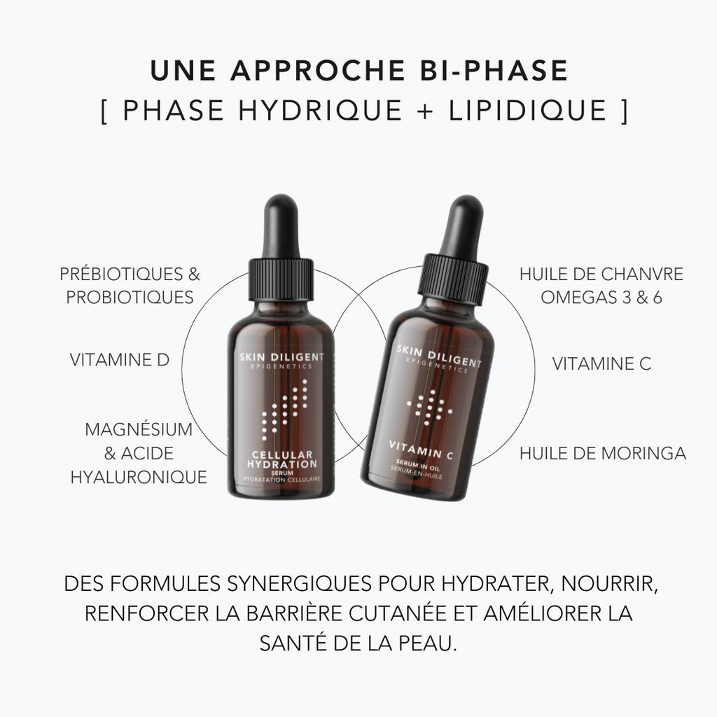 Ensemble, ces deux produits innovants améliorent l'apparence et la santé de la peau de manière complémentaire, l'un par des voies aqueuses et l'autre par des voies lipidiques.