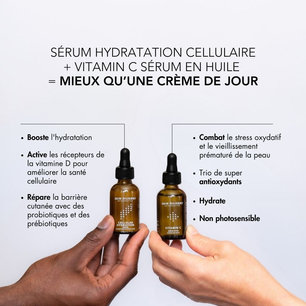 L'application des 2 sérums ne nécessite pas de crème hydratante car tous les besoins de la peau pendant la journée sont satisfaits. Appliquer néanmoins un SPF juste après en cas d’exposition au soleil puis un éventuel maquillage. Une utilisation régulière aide à prévenir le vieillissement prématuré de la peau, favorisant une peau plus saine et plus éclatante.