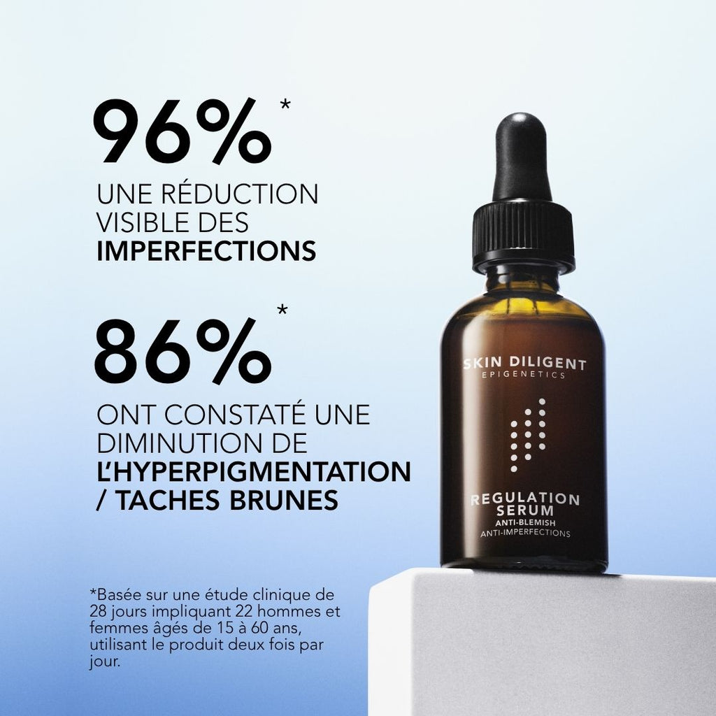 Le SÉRUM REGULATION est une formule épigénétique révolutionnaire spécialement conçue pour cibler les peaux à tendance acnéique, avec des résultats prouvés. C'est une alternative efficace aux traitements agressifs de l'acné et un sérum SOS performant pour les boutons occasionnels. Il est également capable d'atténuer les taches brunes et l'hyperpigmentation.